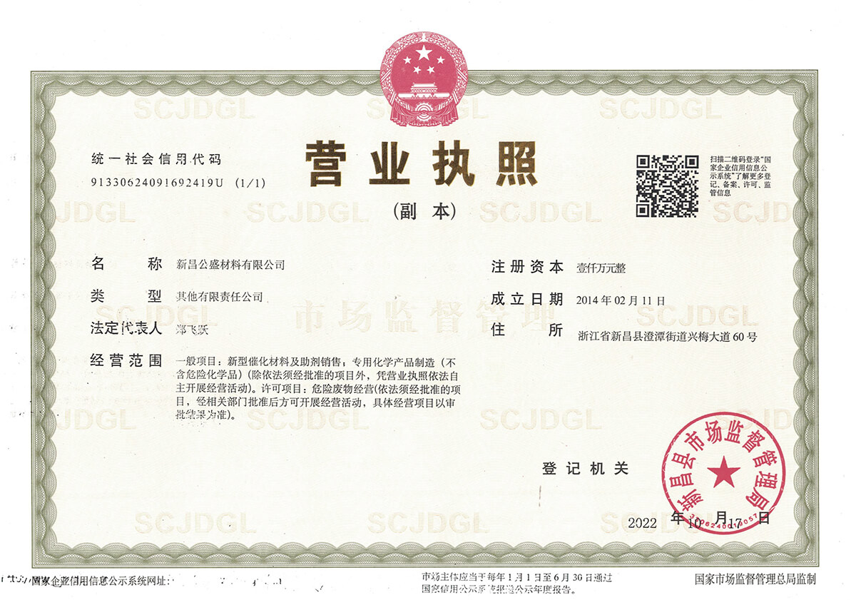 新昌公盛材料有限公司成立于2014年,坐落在江南大佛名城浙江新昌,地理位置優(yōu)越,交通便利,并配備有現(xiàn)代化的廠房和實驗樓,總占地面積80畝。公司聚焦于研發(fā)和生產用于醫(yī)藥、農藥、染料、材料等精細化工領域的貴金屬催化劑。目前主要從事鈀炭、鉑炭、釕炭等多項催化劑及醋酸鈀、DPPF二氯化鈀、雙三苯基膦二氯化鈀、四三苯基膦鈀、DBA鈀等均相催化劑的研發(fā)、生產、銷售以及失效鈀、失效鉑催化劑的回收再加工等業(yè)務。公司成立以來,一直以提升客戶產品的競爭力為經營宗旨,通過持續(xù)改進客戶所用催化劑的性能,來提高客戶產品的收率,提高催化劑的套用次數,提高失效催化劑的貴金屬回收率,來降低客戶產品中貴金屬催化劑的成本,進而提升客戶產品的競爭力。